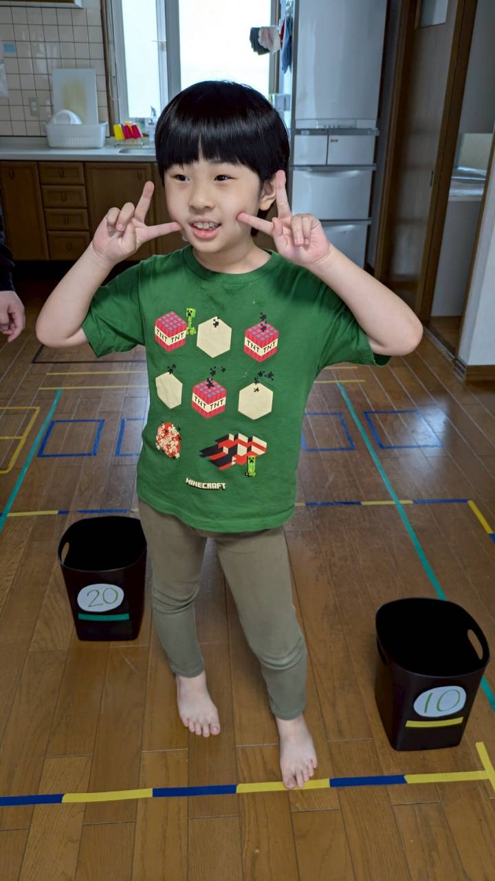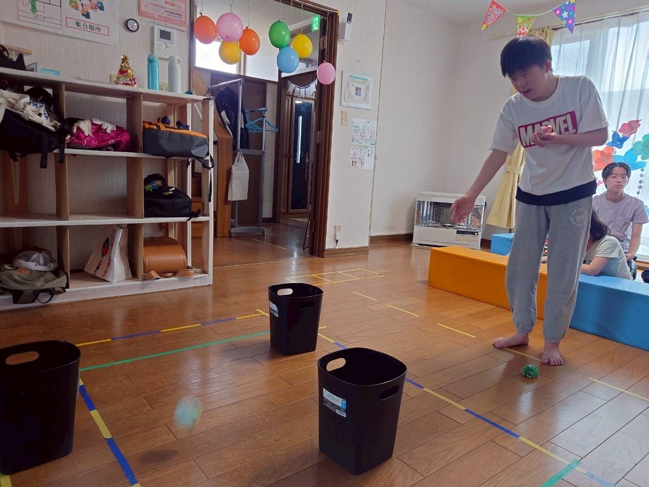 みんなで「お手玉的入れゲーム」では、距離の掴み方や、投げ方の工夫など、楽しみながら身体機能を養う活動を行いました♪